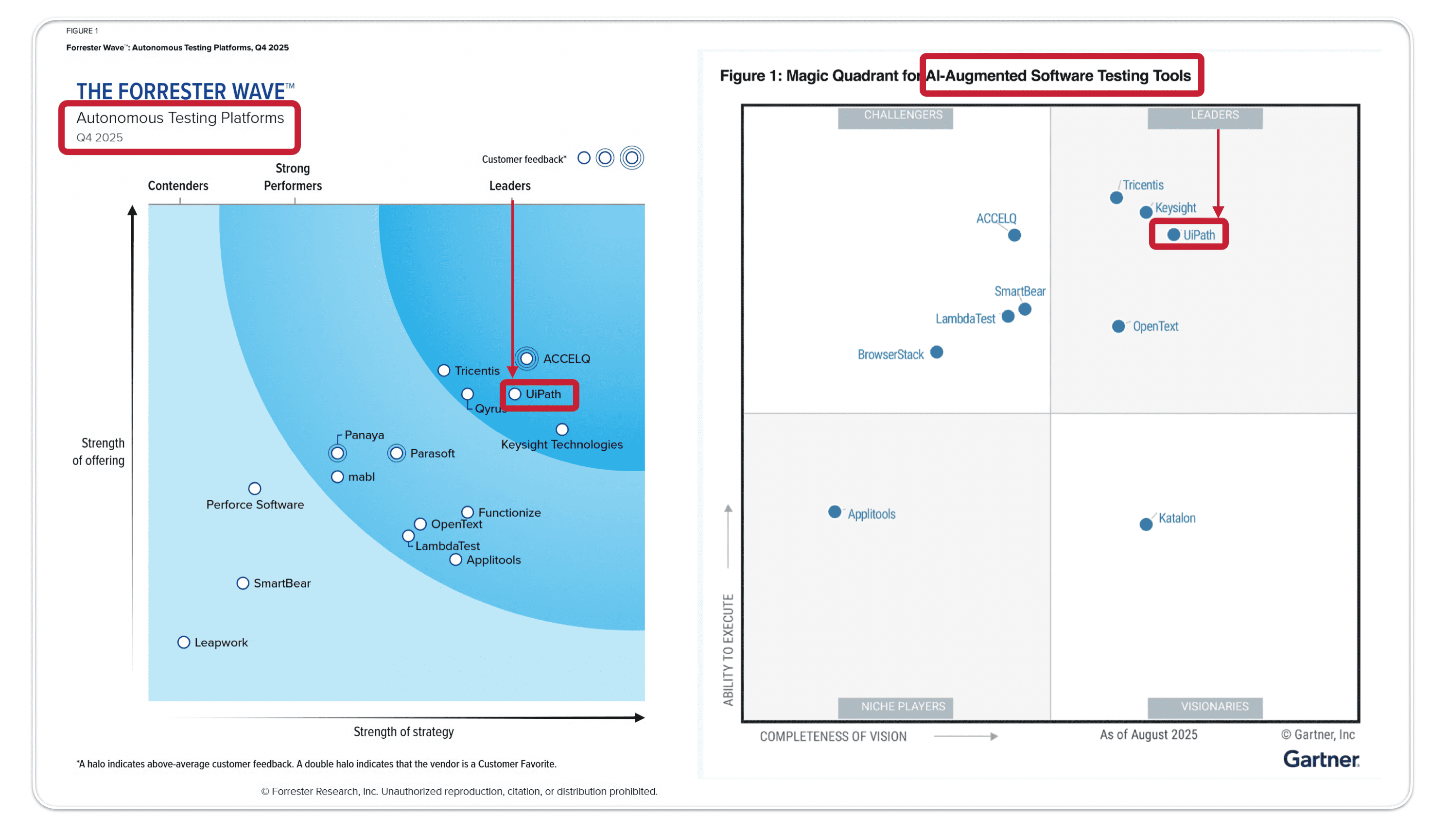 UiPath 在 Forrester 的自主測試平台和 Gartner 的 AI 增強軟體測試工具領域均被評為「領導者」。