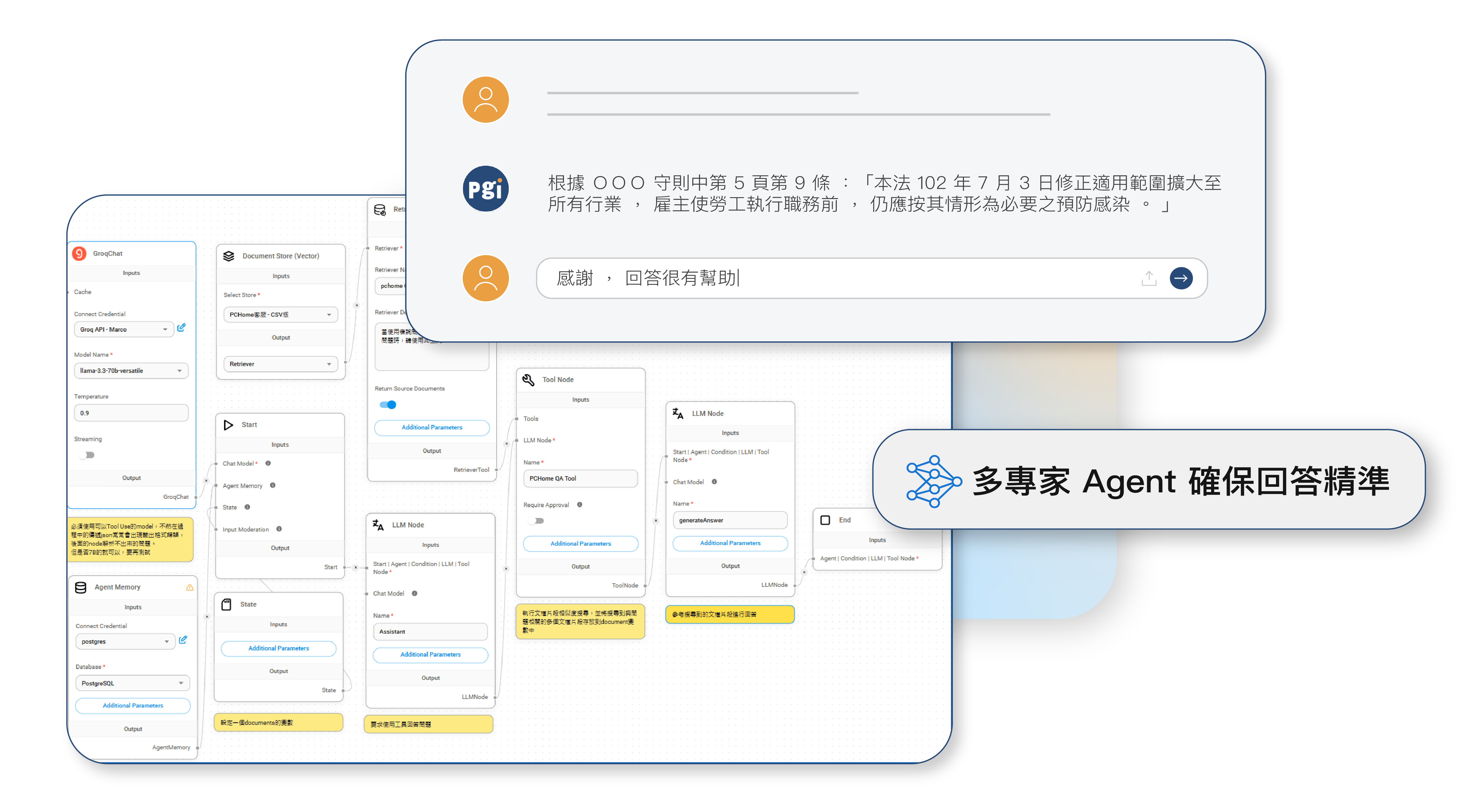 我們透過多專家 Agent 協同技術,讓多個 AI 代理對資訊進行多層次驗證與交叉比對,有效確保回答的精準度與真實性,大幅減少 AI 模型幻覺。